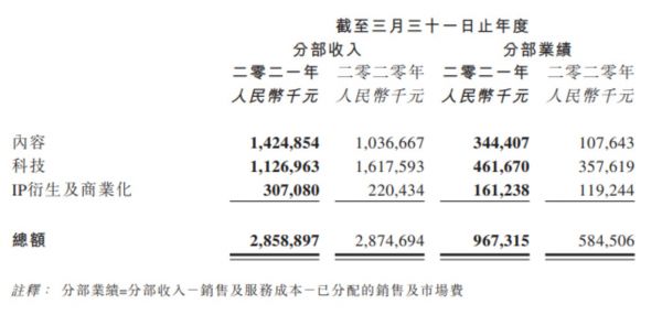 依据财报数据来看,阿里影业营收在内容分部上取得了14.25亿元收入,较以往人民币10.37亿元,增幅在37%,毛利人民币3.44亿元,与过往1.08亿元增220%。