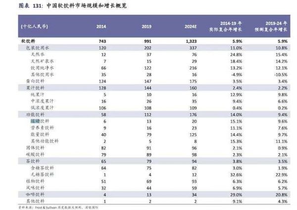 据Frost& Sullivan称,2014-2019年,包括功能性饮料在内的饮料市场规模从580亿元增加到1120亿元,成为继包装饮用水和果汁饮料之后的第三大饮料市场。