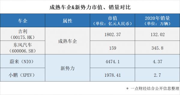 新能源汽车9.4%的渗透率还不未触及拐点(乘联会2021年1-5月数据),新势力成长还不够稳定,不过它们都抢到了先发优势,强壮的身体改变了汽车行业的发展格局。不信?看看它们的市值,已经超过成熟车企了。