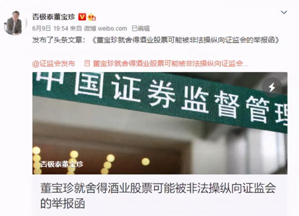 6月9日晚间,一篇名为《董宝珍就舍得酒业股票可能被非法操纵向证监会的举报函》的文章在网上迅速传播,令孟琪和舍得酒业的5.3万名股东(截至2021年3月31日)彻夜未眠。