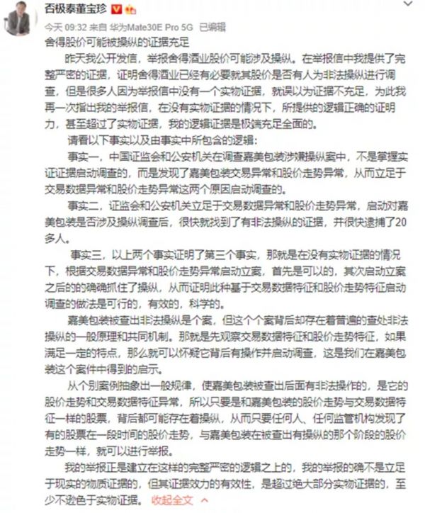 舍得酒业,就是他根据“交易数据异常和股价走势异常”来推断公司股价可能被非法操纵了。