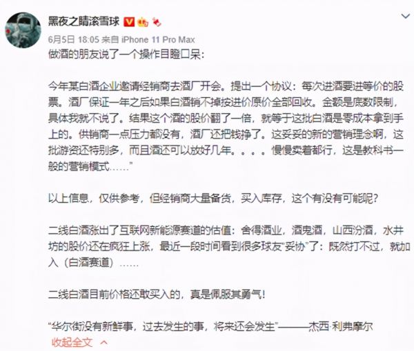 用白话翻译就是:经销商与酒厂联合,经销商买了酒囤货,再买酒的时候同时买入这家酒厂的股票。经销商不着急卖酒,先把酒厂的销售数据做上去,机构们看到酒厂的销售数据这么好,自然就会认为该酒厂在迅速发展,估值低了,开始买买买。