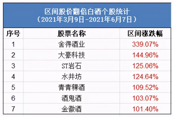 我们从本轮白酒板块最低点3月9日起算起,到最高点6月7日,这一区间内股价翻倍的一共7只,均不是一线白酒。