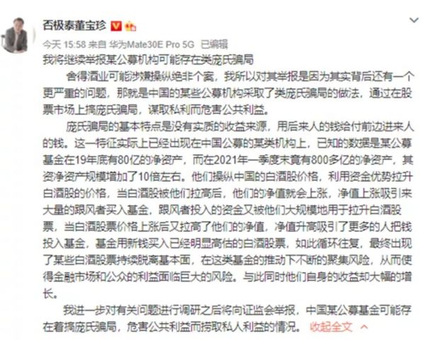 按照董宝珍的说法,他将继续举报某公募机构可能存在类旁氏骗局。