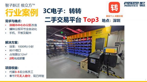 「智子跃迁」( Proton Robotics Inc)成立于2018年,主要业务是解决物流仓库场景中多件订单播种分拣和退货分拣难题——以极立方™智能分拣机器人系统取代当前物流仓库中低效且日益昂贵的人力,据了解,公司从2019年下半年完成产品研发,2020年实现了测试订单、试点订单到量产应用合同订单的跃进。标杆客户包括东方海外物流、转转、五皇冠淘宝服装店铺8090、海南某大型免税店等,且在鞋服、零售、跨境电商、直播电商、前置仓、医药等行业均拥有成熟案例。