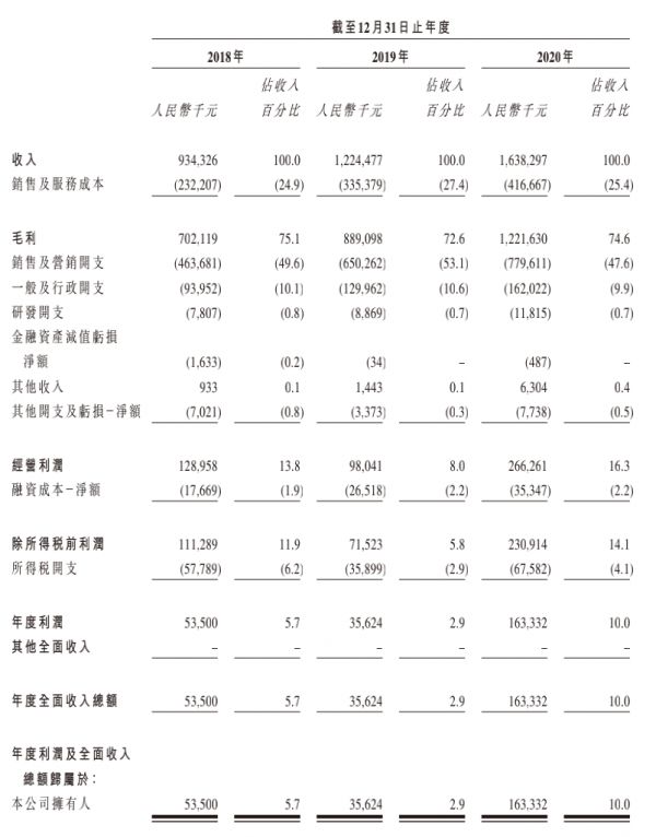 招股书显示,公司已在中国50个城市经营51家医疗机构,并配有约1200人的医疗团队,其中包括229名注册医生和930名护士;此外,其总收入从2018年的9.34亿人民币增长到2020年的16.4亿人民币,毛利常年维持在了70%以上。