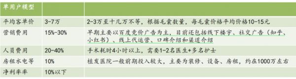 有机构曾估算,植发的平均客单价为3-7万——植发价格为每单位十元起,一般植发手术需要提取的毛囊单位数量大多都是以千计。其背后的成本包括营销费用(15%-40%)、人员费用(20%-40%)、房租水电(10%),最终实际净利润不到10%。