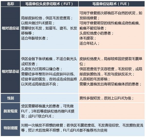 FUT要先在后脑勺切一块头皮,在显微镜下去除多余组织后,分离出单个毛囊单位,移植到需要的区域;FUE是直接提取后脑勺的单个毛囊单位,去除多余组织后移植到需要的区域。