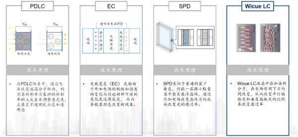 目前,市场上广泛应用的变光膜技术主要有三大技术路径——PDLC(高分子聚合物分散液晶)技术、EC(电致变色)技术和SPD(悬浮粒子装置)技术:
