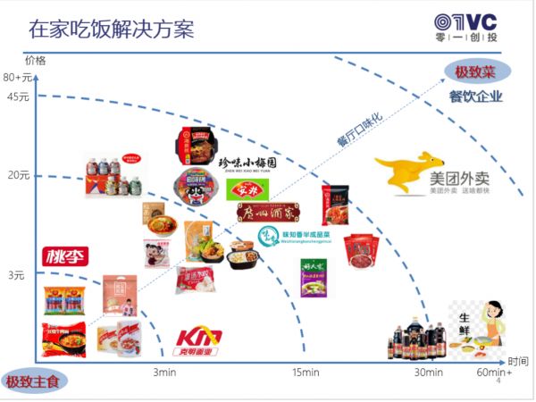 大趋势上:从时间和价格维度来看,象限的两个“极端”非别为极致主食和极致菜。主食满足吃饱,菜满足吃好。每增加一个菜,对应的是食物质量的提升,也对应的是更长的准备时间和更高的成本。
