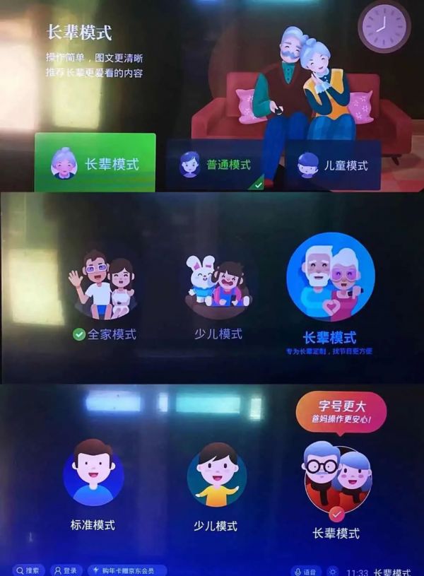以优爱腾为代表的长视频把发力重点落到了智能电视大屏端的“银发族”,相继在CIBN酷喵影视、银河奇异果、云视听极光等上推出了直接面向中老年人群的“长辈模式”。