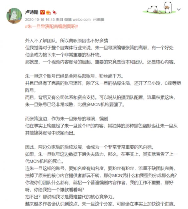 朱一旦这边已经是全网头部账号,粉丝超千万,有了完善的账号矩阵,而且背后又有公司体系和资金支持。可以说从拍摄团队配置,流量积累这块,朱一旦这边已经非常成熟,堪比很多MCN机构了,即便走了编剧,还可以花钱再招。对于许多喊着“铁打的营盘流水的兵”的老板来说,这似乎并不是一件难事。