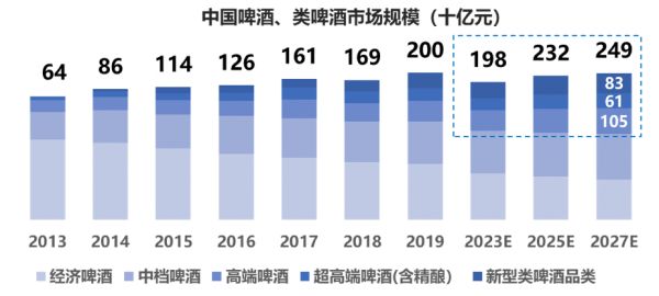 伴随着越来越多年轻人的饮酒消费习惯开始发生改变,低度酒行业也开始重新被塑造。因为这个行业足够大,所以新品牌的机会就越大。根据国家统计局公布的全国啤酒产量统计数据显示,到2027年,我国啤酒和类啤酒饮品的规模将达到2490亿元规模。