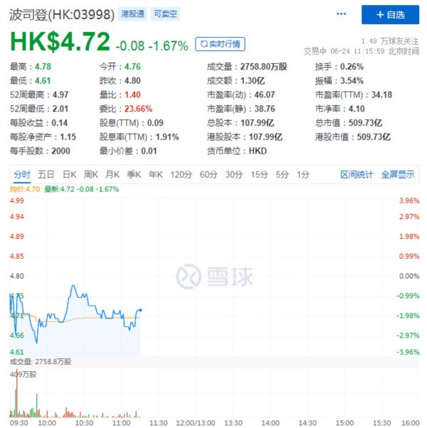 财报的发出,并没有收获到资本市场的看好,次日港股开盘波斯登股价一度下跌近3.5%。