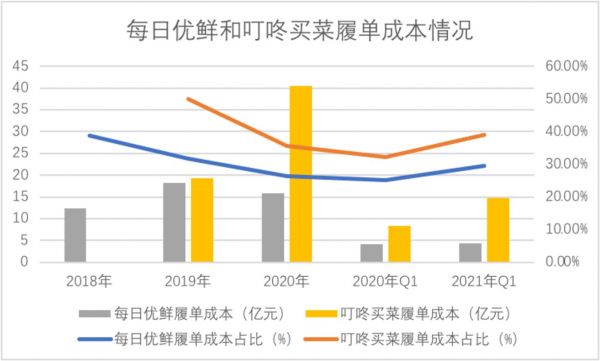 每日优鲜履单成本占比几乎是和毛利率走势呈负相关性,当毛利率较高时,履单成本占比就越低,在2021年Q1毛利率一有所下降,履单成本立即上扬,叮咚买菜也大致是此趋势。