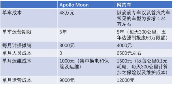 最近百度方面披露最近的Apollo Moon成本已经下降到48万元,由于其他无人驾驶出租企业尚未公布成本,我们就用Apollo Moon对比一二线城市的专车进行运营成本比较。