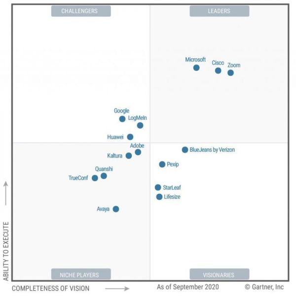 2020年的Gartner魔力象限中,ZOOM,思科Webex和微软Teams处于领导者地位——这是ZOOM第六次出现在这一榜单,它被用来评估一家公司在虚拟会议上的整体实力和市场地位。在第一梯队中,ZOOM在技术前瞻性的领域排名第一。