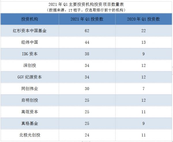 现在,这一轮投资潮的不同点在于,它更加集中于中国市场,更加倾向于硬科技领域,其中的领导玩家也是中国的资本大鳄。2021年Q1,红杉资本中国基金、经纬中国、IDG资本分别投资了62、44、38个项目,同比去年增加了40、31、29个。