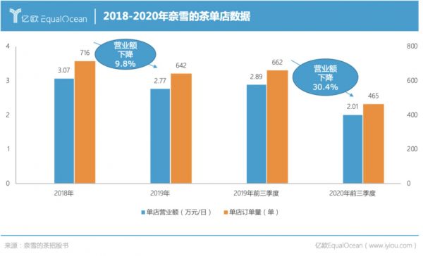 单店日订单量也呈相同走势,2018年、2019年、2019年三季度末、2020年三季度末的数据依次为716单、642单、662单、465单。