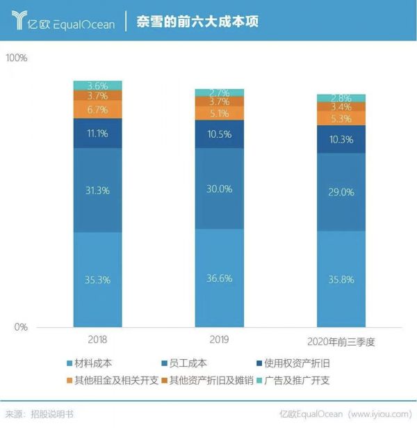 拆解奈雪的成本结构,其材料成本不断上涨,从2018年的35.3%一路上涨至2020年的37.9%,超过总成本的1/3。这由其主打鲜果茶的定位决定,不同于用奶精、果蜜调制成的茶饮,奈雪原料均采用新鲜食材。