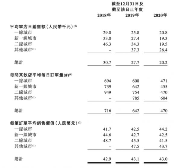 不同等级的城市间,奈雪的茶单店盈利能力也在下降。招股书显示2018年到2020年,奈雪的茶平均单店日销售额分别为3.07万元、2.77万元以及2.02万元。对此,奈雪表示,由于持续开设新的门店,导致到店人数及订单分散程度加大。