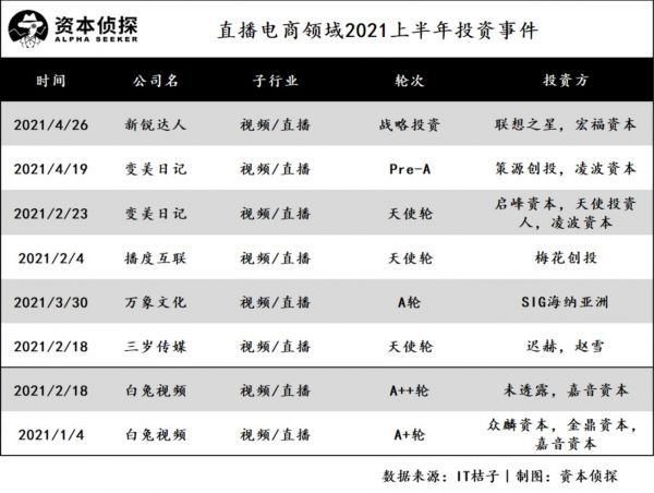 2021年,根据IT桔子数据,在35起针对视频、直播行业的投资中,直播电商占到8起,涉及公司达到6家。其中,白兔视频、三岁传媒获得的融资金额相对较高,达到了亿元人民币级别。而白兔视频和变美日记都分别获得了两轮融资。