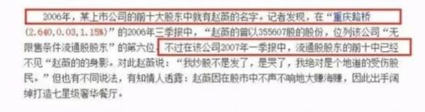 成名后的赵薇,在2002年初就进入了股市。2006年,27岁的赵薇出现在重庆路桥前十大股东之列,持股数量为35.56万股。