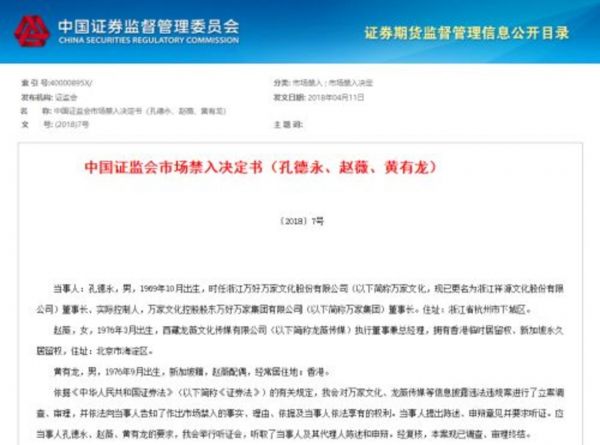 同年4月11日,证监会官网发布了《行政处罚决定书》以及《市场禁入决定书》,处罚结果包括:
