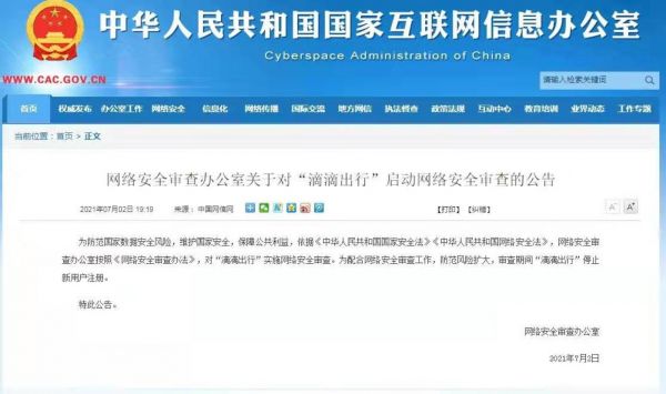 据国家网信网7月2日消息,为防范国家数据安全风险,维护国家安全,保障公共利益,依据《中华人民共和国国家安全法》《中华人民共和国网络安全法》,网络安全审查办公室按照《网络安全审查办法》,对滴滴出行实施网络安全审查。为配合网络安全审查工作,防范风险扩大,审查期间“滴滴出行”停止新用户注册。