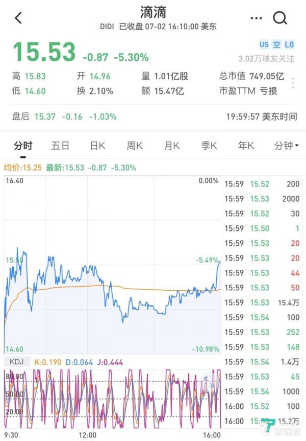 受此消息影响,7月2日,滴滴美股开盘跌幅达10.98%,不过随后跌幅有所收窄,最后滴滴以15.53美元收盘,跌逾5%。