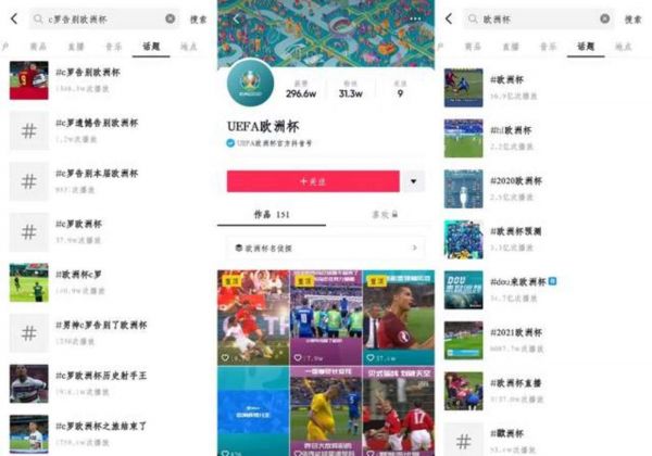 抖音在距离欧洲杯开赛一百天时宣布成为本届赛事官方合作伙伴,并邀请欧足联开设抖音官方账号,在短短五个月里,平台上欧洲杯相关视频的播放量超过56亿,这向外界释放出短视频平台转播体育赛事的潜力。