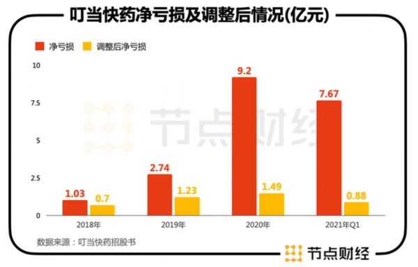 招股书显示,2018 年-2021 年Q1,叮当快药的净亏损则分别为1.03 亿元、2.74 亿元、9.20 亿元和 7.67 亿元,经调整后净亏损是 6955.2 万元、1.23 亿元、1.49 亿元和 8821.2 万元。