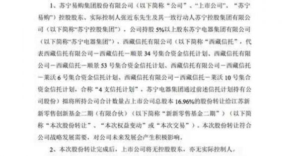 钛媒体快讯|7月5日消息:苏宁易购发布公告称,公司大股东拟转让16.96%股份于江苏新新零售创新基金二期(有限合伙)(下称“新新零售基金二期”)。公司控股股东、实控人张近东及其一致行动人苏宁控股集团,公司持股5%以上股东苏宁电器集团,西藏信托拟将所持公司合计数量占公司总股本16.96%的股份。