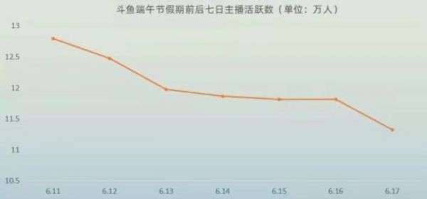 小葫芦数据也显示,端午假期前后7日,斗鱼活跃主播就从12.79万人降低到11.32万人,活跃主播数量七天内下滑14700名。