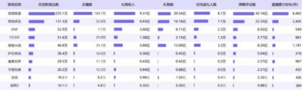 据小葫芦发布的《2020游戏直播行业数据报告》显示,2020游戏直播综合数据TOP10分别为《王者荣耀》《英雄联盟》《和平精英》《绝地求生》《DNF》《CS:GO》《穿越火线》《炉石传说》《魔兽世界》《守望先锋》。