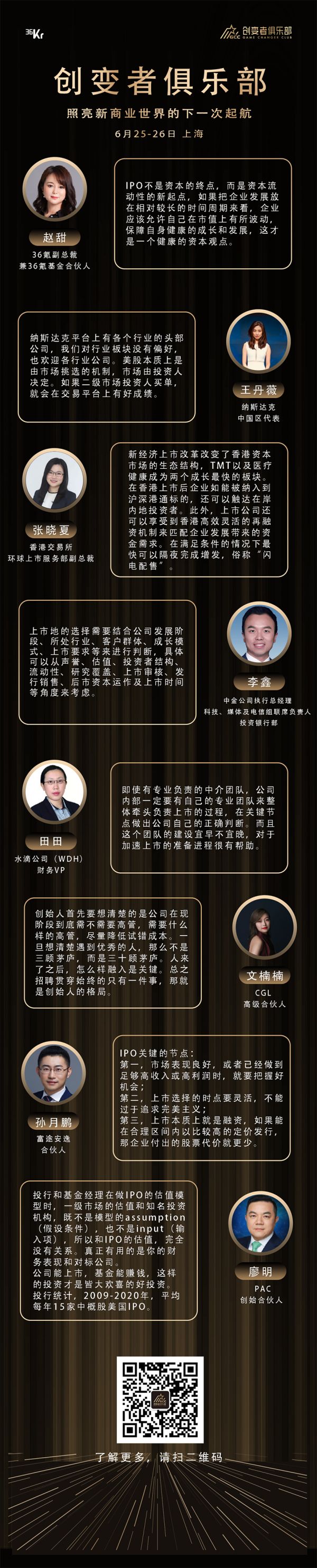 在这一前提之下,36氪日前于举办了第三期创变者私董会。本期私董会邀请到了来自纳斯达克中国区代表王丹薇、香港交易所环球上市服务部副总裁张晓夏、富途安逸合伙人孙月鹏、中金公司执行总经理李鑫、汇丰私人财富规划朱强,以及曾任饿了么CFO、优酷土豆CFO;曾任分众财务VP、阿里财务VP的徐舸,水滴公司(WDH)财务VP田田、CGL高级合伙人文楠楠、PAC创始合伙人廖明等嘉宾一起,和众多准IPO企业一起共话2021年的二级市场走向。