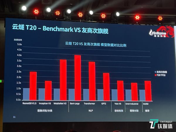 由图可见,云燧T20 TF32精度性能平均2.5倍于友商次旗舰。而在多类模型测试中,云燧T20与友商旗舰性能几乎不分伯仲,即6种测试项目中有4个超越了友商旗舰的性能表现。