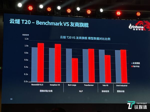 在发布会上,燧原科技COO张亚林展示了T20与友商(英伟达V100、A100)的Benchmark对比跑分。