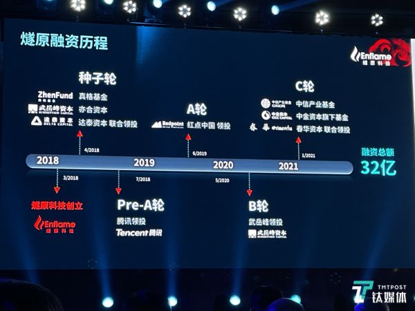 2018年4月,燧原科技完成由真格基金、亦合资本、达泰资本联合领投的种子轮;2018年7月,燧原科技完成3.4亿元人民币pre-A轮融资,领投方为腾讯;2019年5月,燧原科技完成3亿人民币A轮融资,领投方为红点创投中国;2020年5月,燧原科技完成7亿元人民币B轮融资,领投方为半导体产业基金武岳峰资本,老股东腾讯继续跟投;2021年1月,燧原科技完成的18亿人民币C轮融资,由中信产业基金、中金资本旗下基金、春华资本领投。