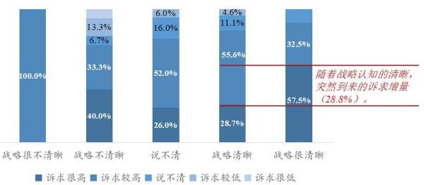 我们发现,样本企业在这两个口径的计量里,都出现了需求的突然跃升。具体来说,随着战略从“清晰”到“很清晰”,随着人效从“较高”到“很高”,企业组织转型“诉求很高”的占比明显跃升,分别多出28.8%和27.4%。巧合吗?两个增量数据居然差不多!