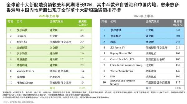 而据德勤发布的《2021年上半年中国内地及香港IPO市场回顾与前景展望》显示,全球前十大新股融资额较去年同比大涨32%,其中过半来自香港和中国内地;而香港2021年前十大IPO项目中,前五大都是内地科技及物流企业。