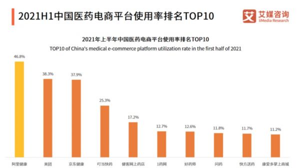 除了两大龙头,医药电商领域同样不能忽略美团。艾媒咨询数据显示,2021年上半年,医药电商用户使用率最高的平台是阿里健康,使用率为46.8%,其次是美团和京东健康,使用率分别为38.3%和37.9%。