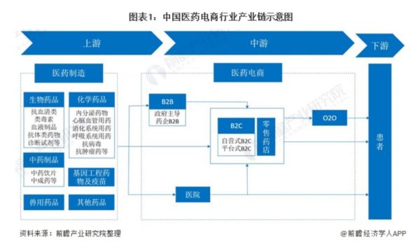 原因是多方面的,这与医药电商的属性有关。医药电商属于医药流通环节,平台将线下售药延伸到线上,连接药企、经销商、零售药店、医院和终端患者。其中,产业链上游为医药制造,中游为医药电商行业,主要通过B2B、B2C、O2O等商业模式进行线上药物售卖,下游是终端患者。
