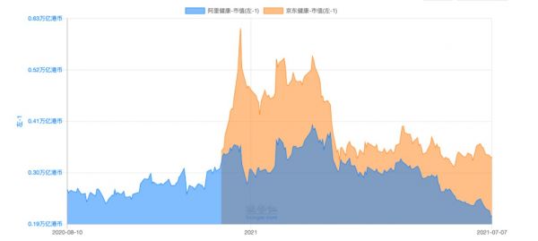 5月25日,阿里健康发布2021财年年报后,股价连跌三天,整体跌幅达10.4%。时至今日,阿里健康股价依旧没有回升,处于连续阴线。对比京东健康,尽管二级市场的反馈优于阿里健康,但自今年3月初开始,两者市值较高位均出现不同程度下滑。