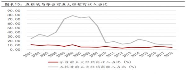 五粮液真正意识到大商制弊病是在08年前后,2005-2008年间五粮液前五大经销商营收占比超70%,而同期茅台占比一直在10%附近。直到2009年开始,大商制问题才开始有所有改观,到10年降至20%以下。