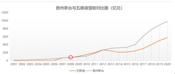 从营销改革和品类聚焦上看,五粮液的改革显然了“慢半拍”,未能及时完成转换,直到2008年意识到问题时,品牌力度早已被茅台超越。
