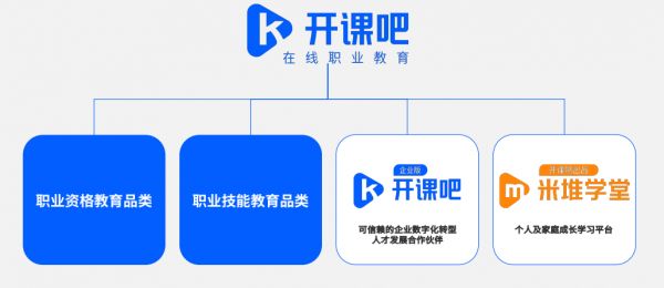 自此,开课吧就形成了四大业务:职业资格教育品类、职业技能教育品类、企业服务品类、个人和家庭成长学习平台。同时,开课吧也就正式完成了从“数字化人才在线教育平台”升级到“在线职业教育”的升级转变。
