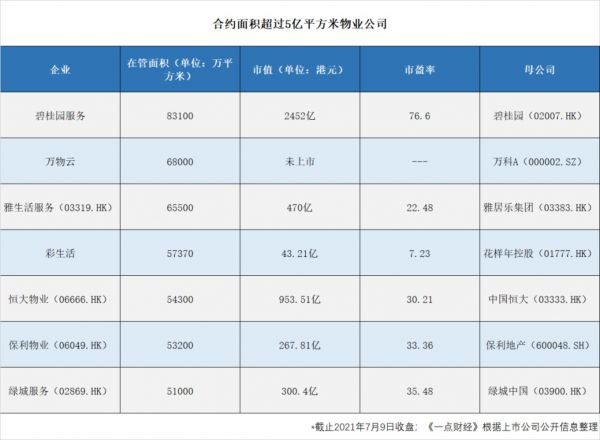 至于合约面积5亿平方米的规模,能让彩生活继续身处第一梯队,但这也算不得优势了。根据克而瑞的统计数据,在管面积在5亿平方米的物业公司已经有7家。讽刺的是,7家公司中市值最低的正是彩生活(万物云未上市)。