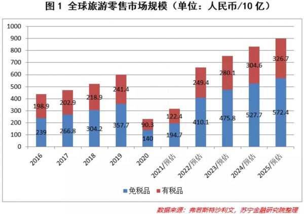首先来看全球旅游零售市场的情况(如图1)。2016年,免税品旅游零售额占全球旅游零售市场的54.6%,2016-2019年间的年复合增长率为14.4%,而同一时期内有税品零售额的年复合增长率只有6.7%。2019年和2020年,全球旅游零售业受到新冠疫情的沉重打击,各国政府积极采取行动刺激免税行业的发展,2020年底,免税品旅游零售额占全球旅游零售市场的份额上升至60.8%。2022年至2025年,弗若斯特沙利文预计免税品旅游零售年复合增长率为11.8%,至2025年底绝对规模达5724亿人民币,占全球旅游零售市场总体的63.7%。