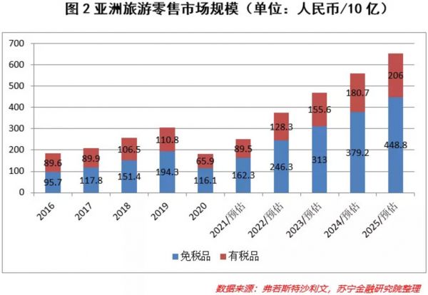 其次来看亚洲旅游零售市场的情况(如图2)。亚洲的旅游零售市场按大洲来看是全球增速最快的市场之一,2016-2019年的年复合增长率为18.1%,其中免税品的年复合增长率为26.6%。弗若斯特沙利文预计,如果新冠疫情在2022年初得到有效控制,叠加免税行业的发展、免税品消费从海外回流中国,将推动亚洲免税行业在2022-2025年间以22.1%的年复合增长率快速增长,并于2025年达到4488亿人民币的规模,占亚洲旅游零售市场的68.5%。